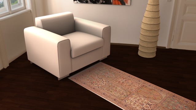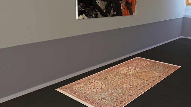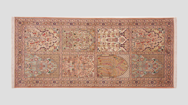 Las alfombras de seda de Cachemira son hechas al 100% de seda natural para el velludillo, y de algodón para la base. La seda provee el brillo, y el algodón satisface la alta exigencia de durabilidad. La densidad de nudos en las piezas que ofrecemos – más de 550 000 nudos/m2 – es notable para una alfombra de seda sobre algodón y corresponde a la categoría de calidad más alta de las alfombras de seda de Cachemira. Los patrones típicamente orientales son diseñados con colores decentes, mayormente colores pastel. Esta alfombra está anudada completamente de seda.