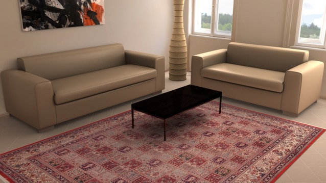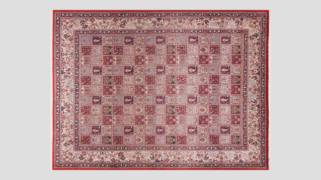 Las alfombras Moud se distinguen por sus áreas elegantes, de patrones finos, que aparecen en el fondo cerca del centro. Para enfatizar los contrastes, en esta alfombra se ha incorporado seda en los bordes de los diseños.