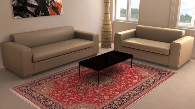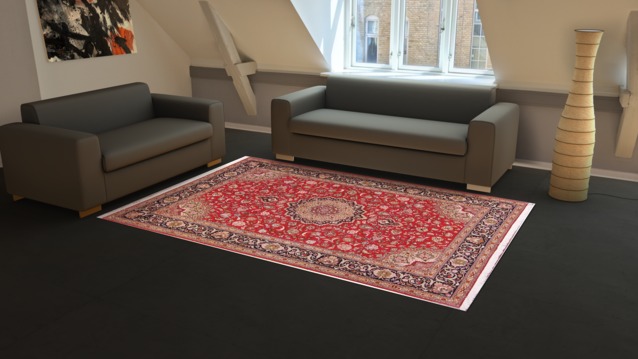 Las alfombras Tabriz, ejemplos típicos para las alfombras provenientes de las ciudades residenciales de los antiguos gobernantes persas, son anudadas muy finamente y diseñadas con mucha elaboración. Para enfatizar los contrastes, en esta alfombra se ha incorporado seda en los bordes de los diseños.